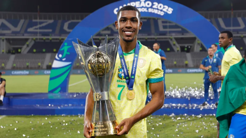 Rayan segurando o troféu do título sul-americano sub-20, em 2025 – Foto: Rafael Ribeiro/CBF